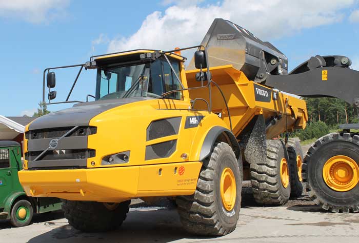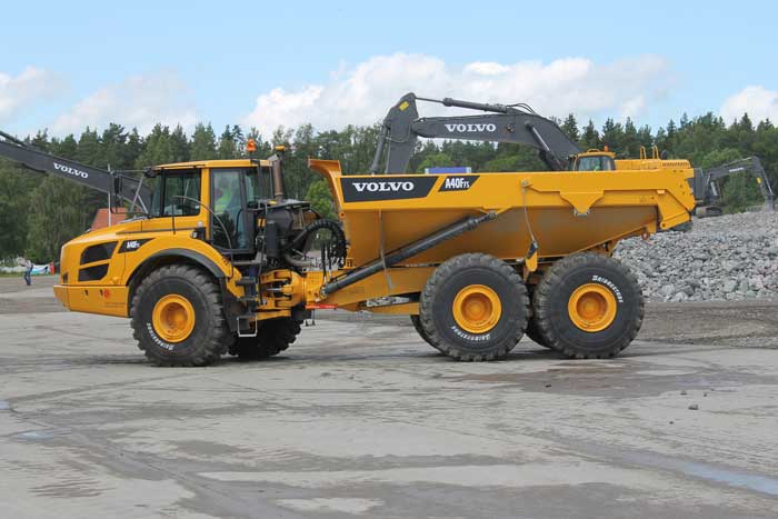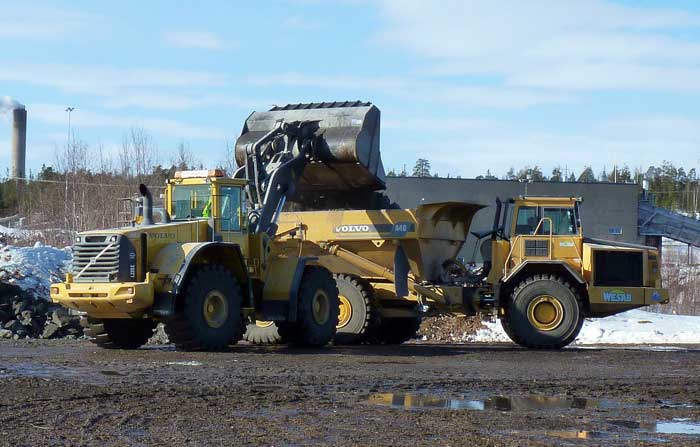 Volvo A40 som lastas av en Volvo L220E