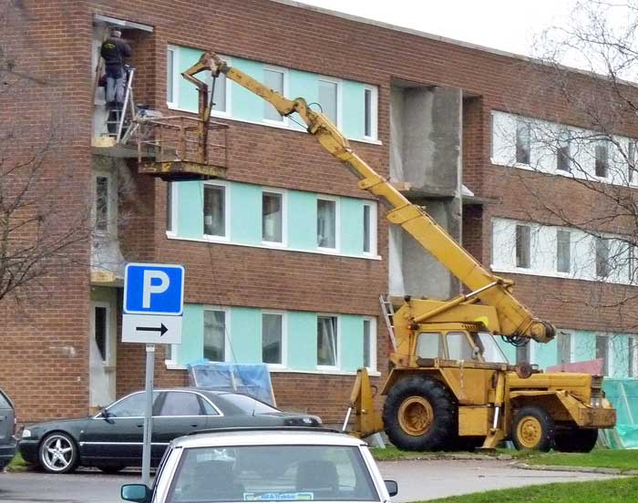 I september 1981 användes en Volvo BM mobilkran vid monteringen av en begagnad arbetsplatsbarack som nu skulle bli lillstuga på en lantgård.