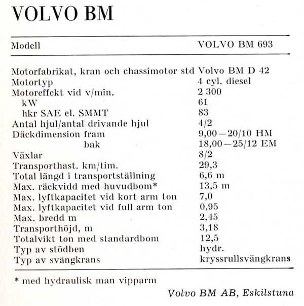 MK693 byggdes på chassit till Volvo BM 650 Industri. Motor Volvo BM D42 på 80 hk vid 2300 v/min. Totalvikt 12,920 ton. Största nettolast kort arm: 7 ton, lång arm 0,95 ton. Största höjd över marknivå 16,00 m. Tillverkades 1974-1980