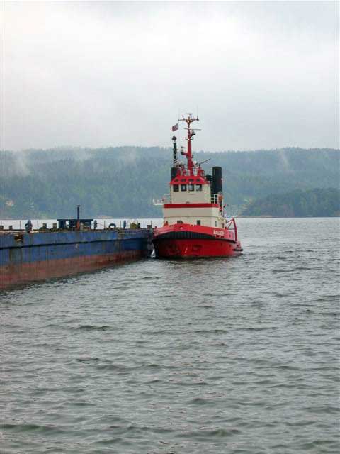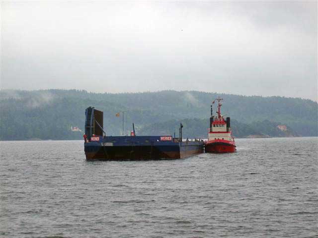 Sandinges pråm Werner, som är byggd 1977 på Finnboda Varv. Måtten är 75 x 19,5 x 4,3 m.